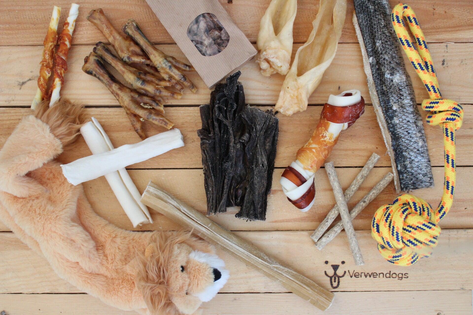De Verwenbox - Junior is geschikt voor jouw puberende boefje van 6-18 maanden leeftijd. Herhaling van de trainingen is een must in deze periode en daar zijn de lekkere beloningen hard bij nodig. Belangrijk is het gewicht van de opgroeiende hond gezond te houden en het skelet te ondersteunen. De box bevat 100% natuurlijke snacks en kauwbotten die meegegroeid zijn met jouw pubertje en die het opgroeiende lichaam ondersteunen.